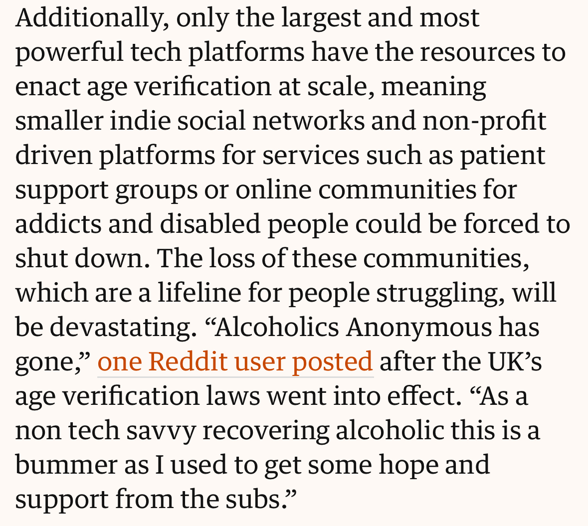 Article also by Taylor Lorenz: «[OSA] has led to mass censorship, with the de facto removal of vast swaths of content from the web. Tech companies find it easier and cheaper to simply remove mass amounts of information than have something slip through and be deemed non-compliant.»