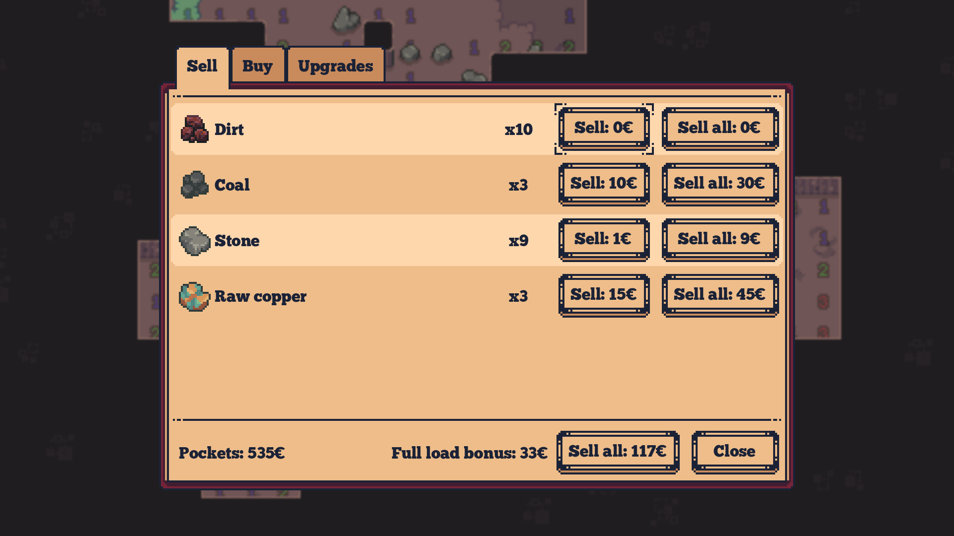 In case it feels disappointing to return to the elevator carrying nothing but dirt, I added a bonus for returning with a full inventory. It's equal to the size of your inventory + 10% of the value of what you're carrying.