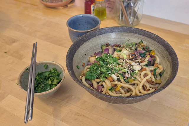 Today we had udon noodles with veggies and oyster mushrooms topped with coriander, fresh cress sprouts and sesame seeds. ❤